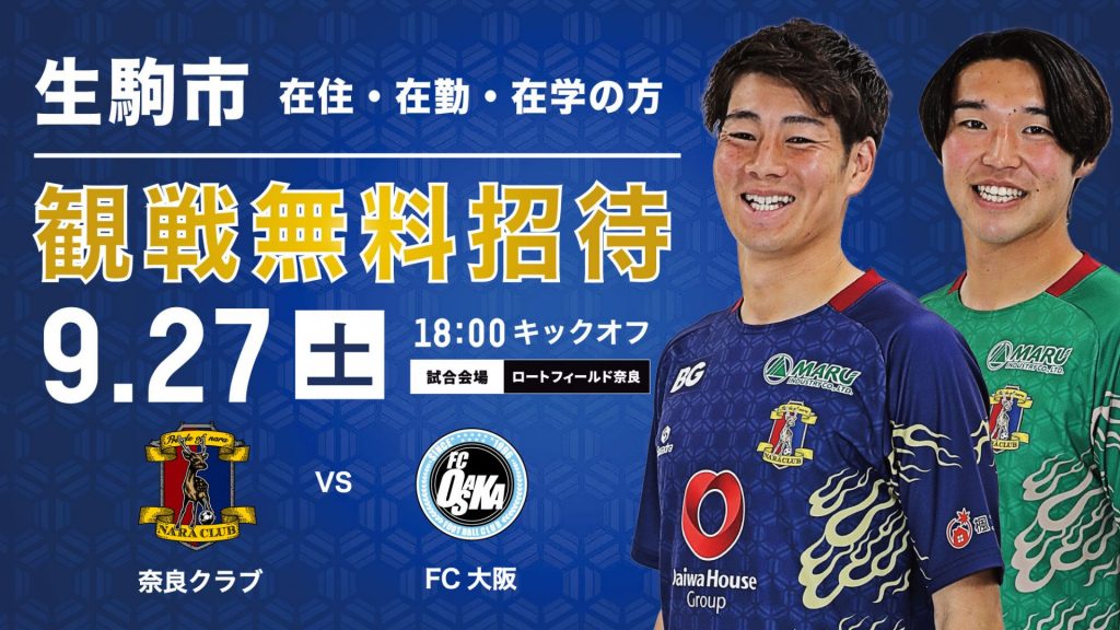 9月27日(土)に開催のホームゲーム「奈良クラブ vs FC大阪」にて生駒市民デーを開催いたします。生駒市民の方を無料で招待いたします。