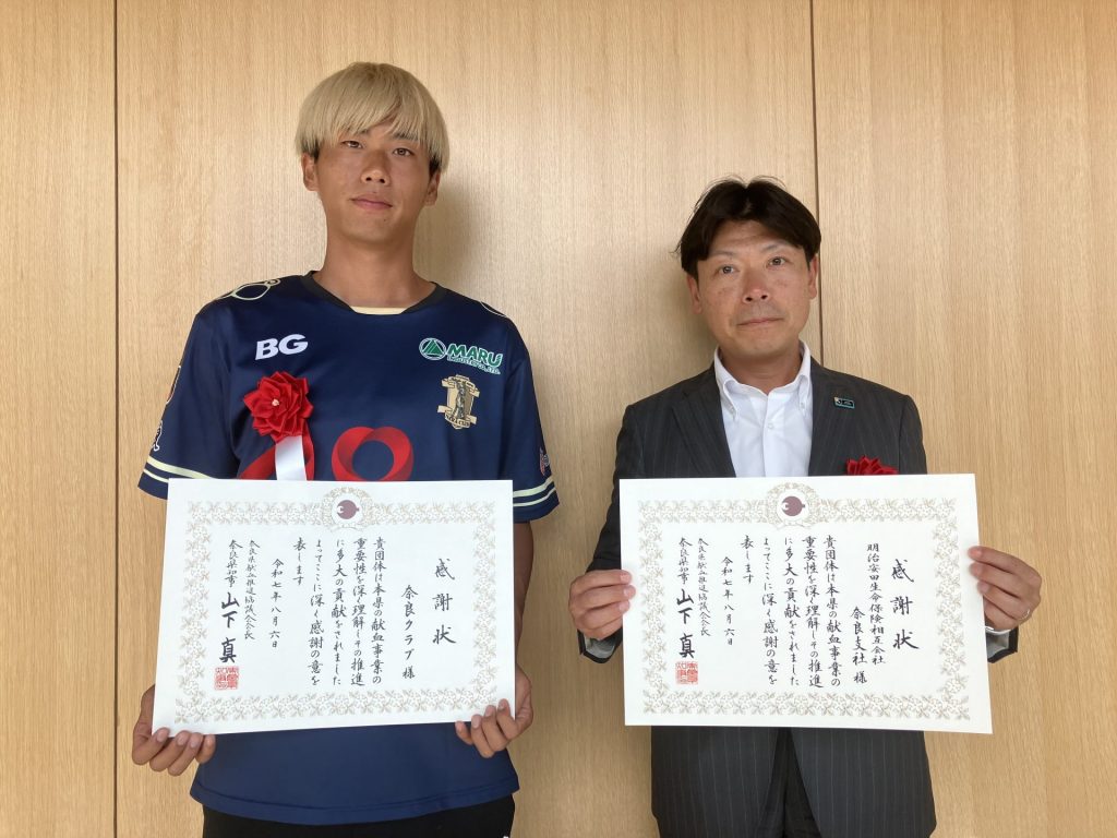 8月6日、奈良公園バスターミナル・レクチャーホールにて「令和7年度薬事功労者・献血功績社表彰式」が執り行われ、明治安田奈良支社様と一緒に取り組んだ「シャレンで献血」活動で、奈良県献血推進協議会会長感謝状を贈呈頂きました。式典にはクラブを代表し、森田凜選手が出席しました。