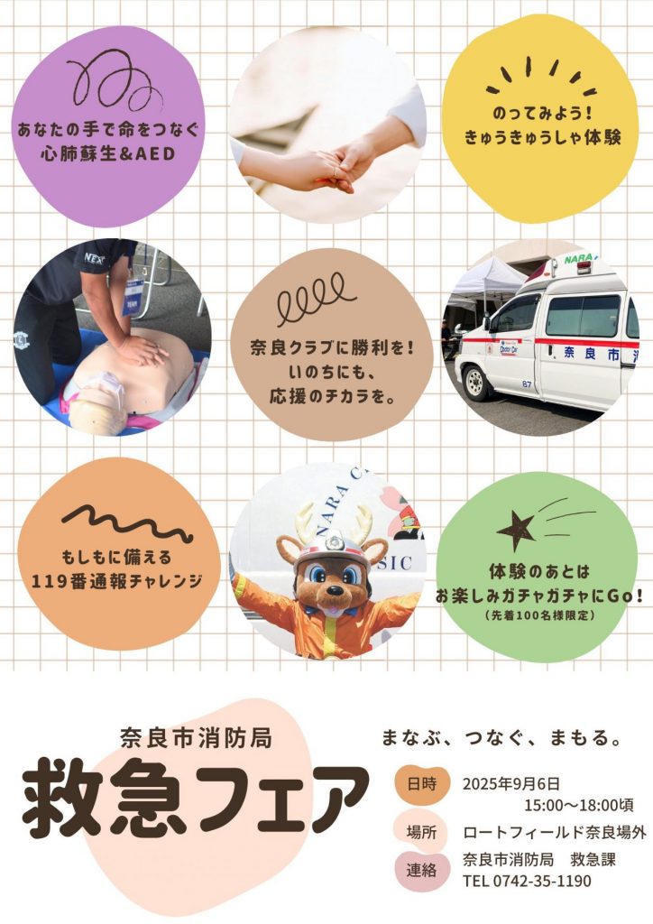 この度9月6日(土)カマタマーレ讃岐戦で、奈良市消防局より「救急フェア2025」ブースが出展しますのでお知らせいたします。