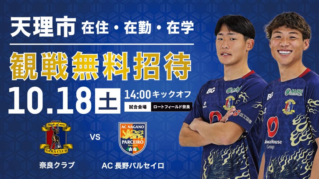 10月18日(土)に開催のホームゲーム「奈良クラブ vs AC長野パルセイロ」にて天理市民デーを開催いたします。天理市民の方を無料で招待いたします。
