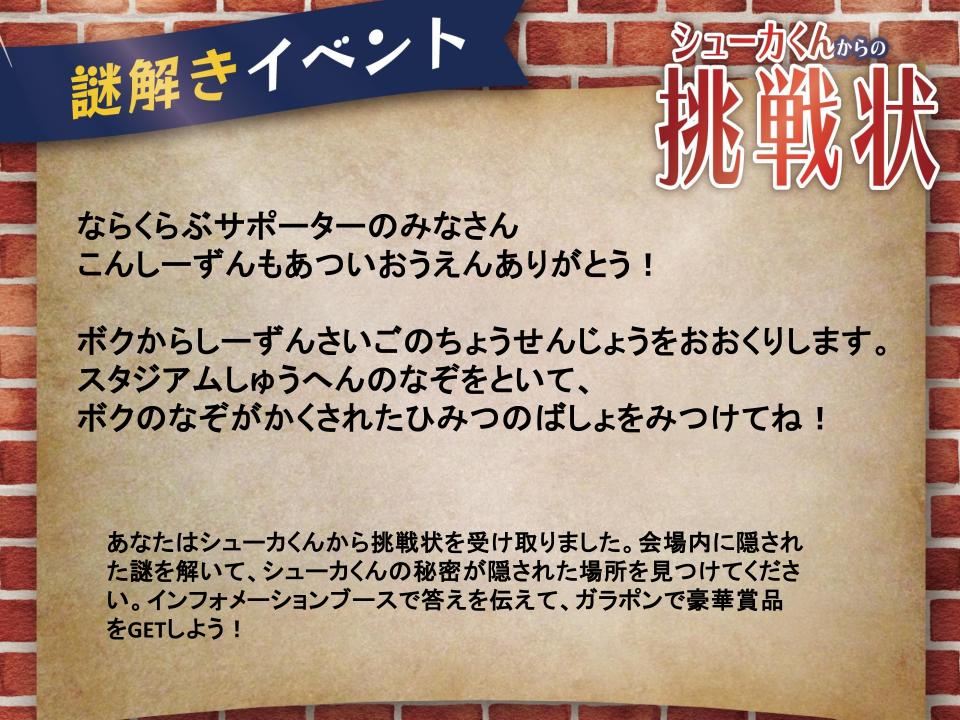 このたび、11月24日のSC相模原戦で「シューカくんからの挑戦状」謎解きイベントを開催いたします。