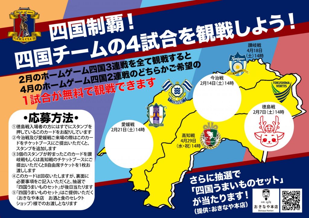 さらに、上記の4試合をご観戦したファン・サポーターの中から抽選で10名様に「四国うまいもん詰め合わせセット(おきなや本店ご提供)」をプレゼントいたします!