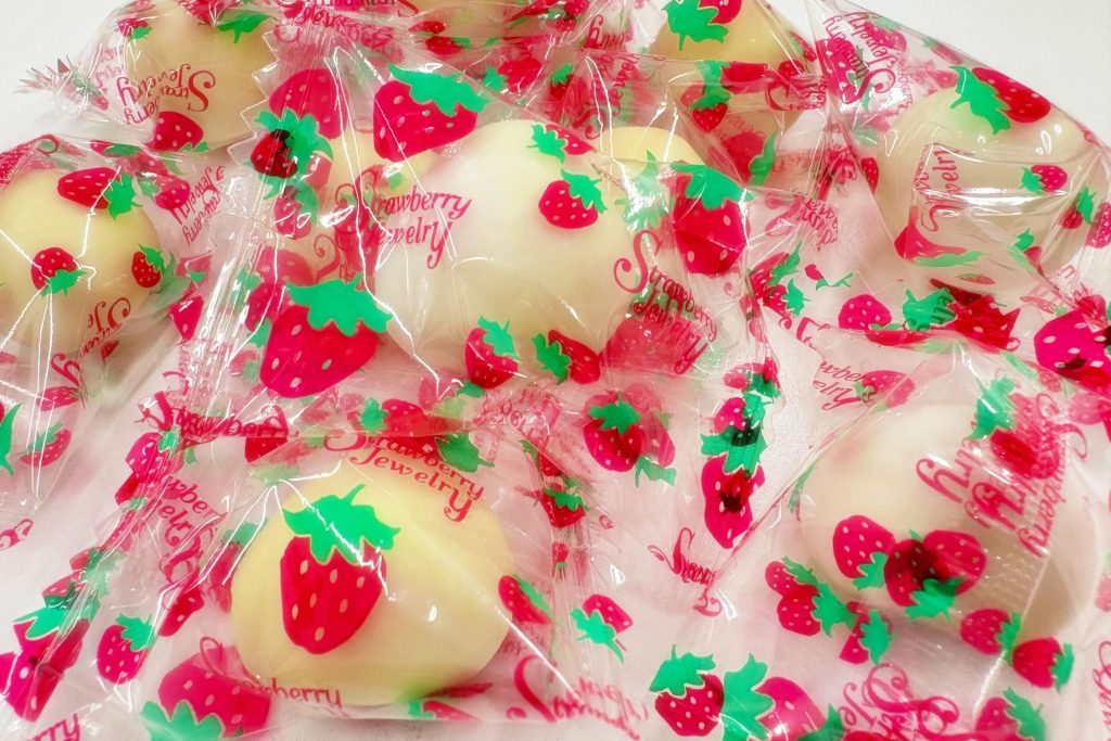 原材料準チョコレート(砂糖、植物油脂、全粉乳、乳糖、ココアバター)(国内製造)、乾燥イチゴ、食用精製加工油脂/乳化剤、香料、(一部に乳成分、大豆を含む)