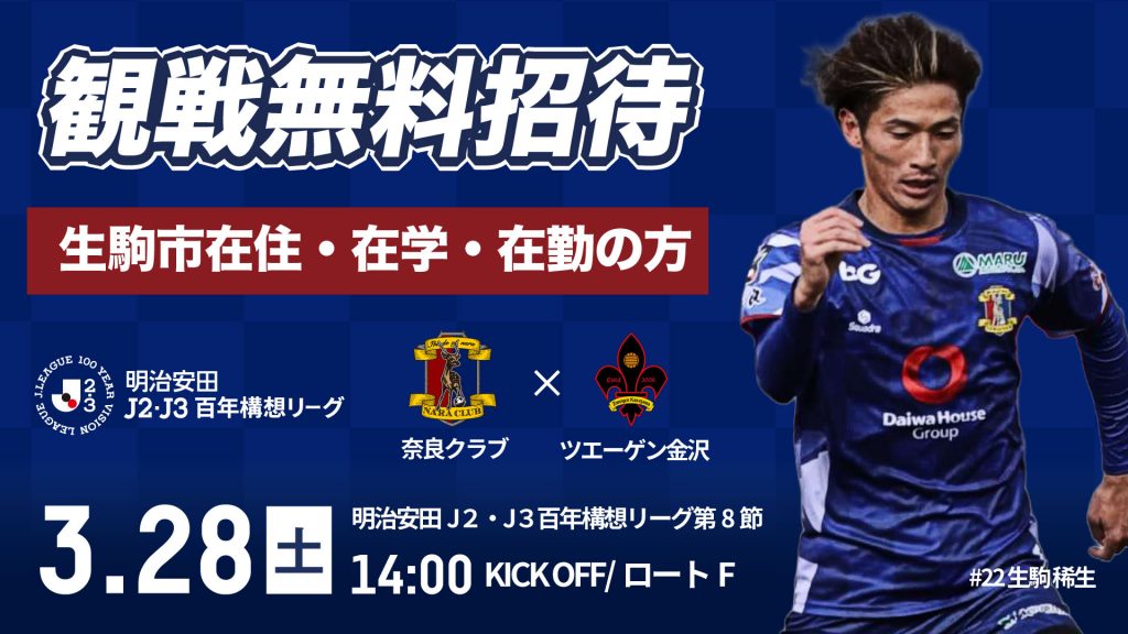 3月28日(土)に開催のホームゲーム「奈良クラブ vs ツエーゲン金沢」にて「生駒市民招待」を実施いたします。生駒市在住 or 在勤 or 在学の方を無料でご招待いたします。