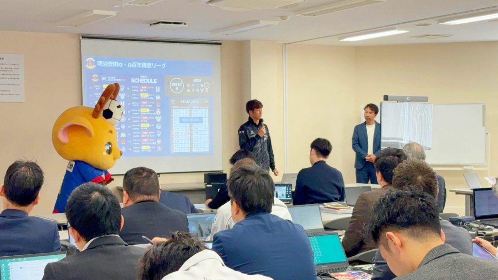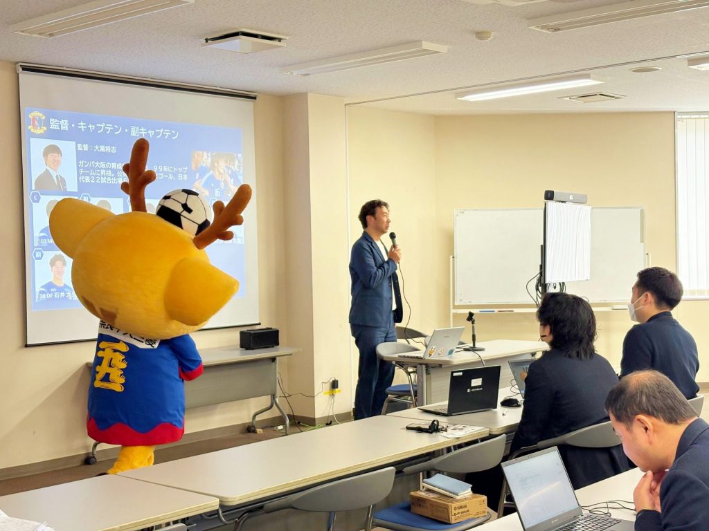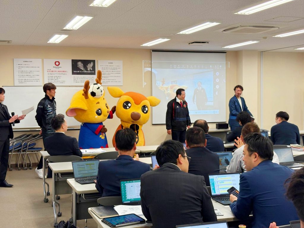 地域共創パートナーの大和ハウス工業株式会社 奈良支店を濵田満社長、鈴木大誠 選手、シューカくんが訪問し、朝礼に参加しました。明治安田J2・J3百年構想リーグについてや、チーム状況などを社員の皆様にお話ししました。