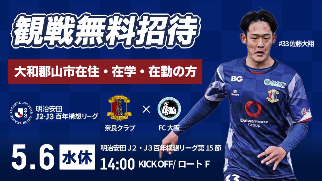 5月6日(水・休)に開催のホームゲーム「奈良クラブ vs FC大阪」にて「大和郡山市民招待」を実施いたします。大和郡山市在住 or 在勤 or 在学の方を無料でご招待いたします。