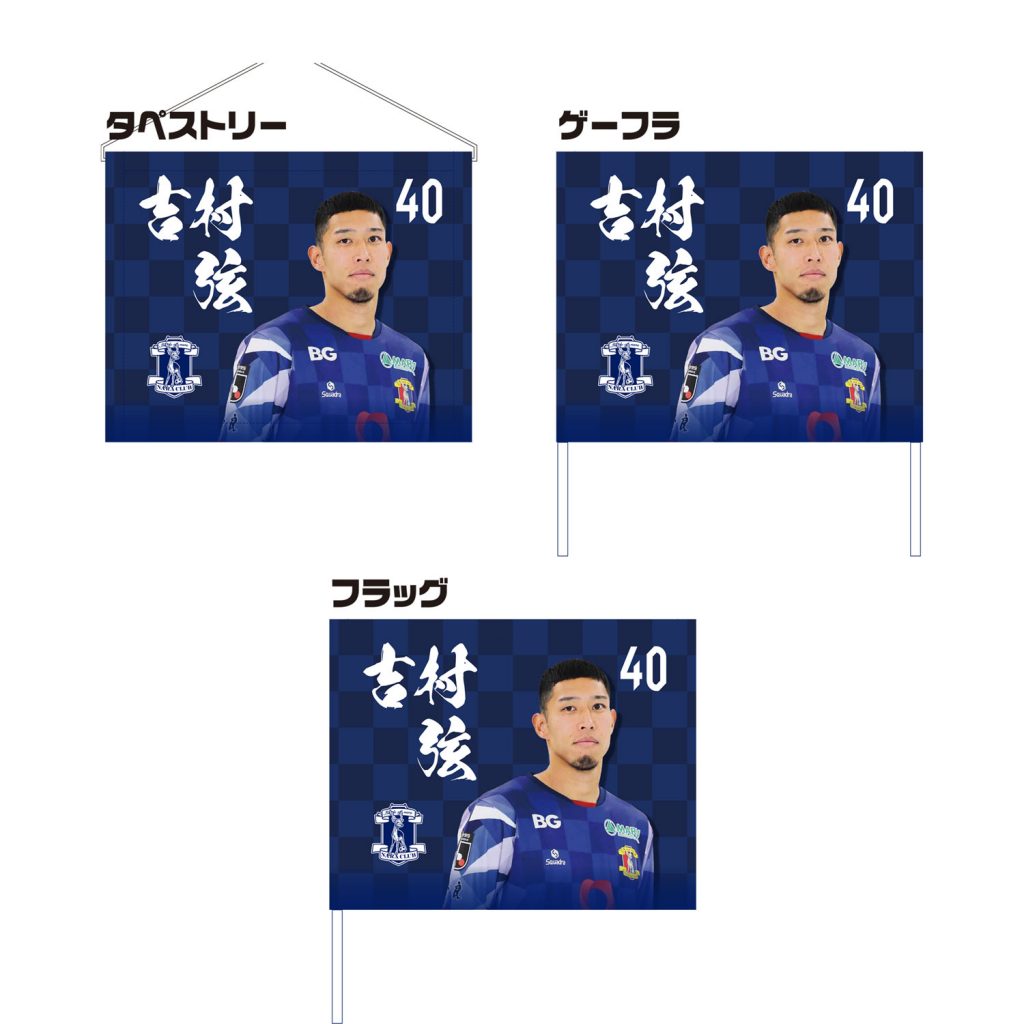 「選手3WAYフラッグ」がついに登場です。スタジアムを青に染めるだけでなく、日常から推し選手を身近に感じられる、機能性と熱量を兼ね備えた万能アイテム。普段はタペストリーとして、スタジアムでは応援フラッグ、そしてゲーフラとして3種類の使い方が可能です。全選手(29種類)+シューカくんのラインナップ。