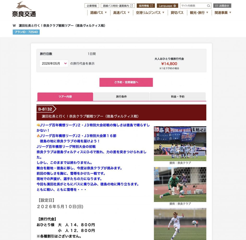 この度、奈良クラブパートナーである奈良交通様が5月10日(日)に開催される「明治安田J2・J3百年構想リーグ第16節 徳島ヴォルティス VS 奈良クラブ」の観戦ツアーバスを販売くださいます。