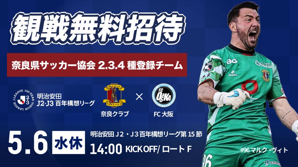 このたび奈良クラブは「奈良県サッカー協会2.3.4種にご登録いただいているチーム」の皆さまを「明治安田J2・J3百年構想リーグ 5/6(水・休)FC大阪戦」へご招待させていただくこととなりました。本企画が奈良県サッカーの盛り上げに少しでも役立てればと思っております。